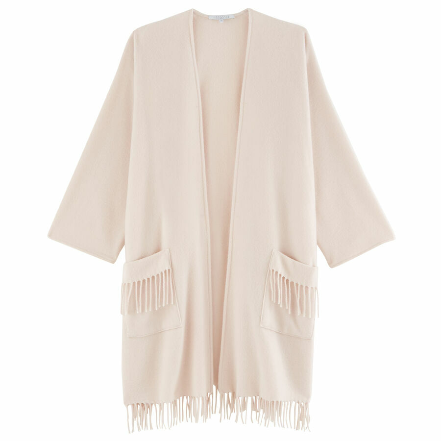Description3/4 wool blend poncho, fringed finishes on the pockets and bottom of the model