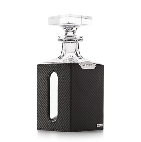 This lead crystal decanter features a rotating nickel plate engraved with "Whiskey," "Gin," "Rum," "Scotch" and "Vodka" to indicate your spirit. Its carbon fiber–embossed leather exterior is also removable for convenient cleaning.