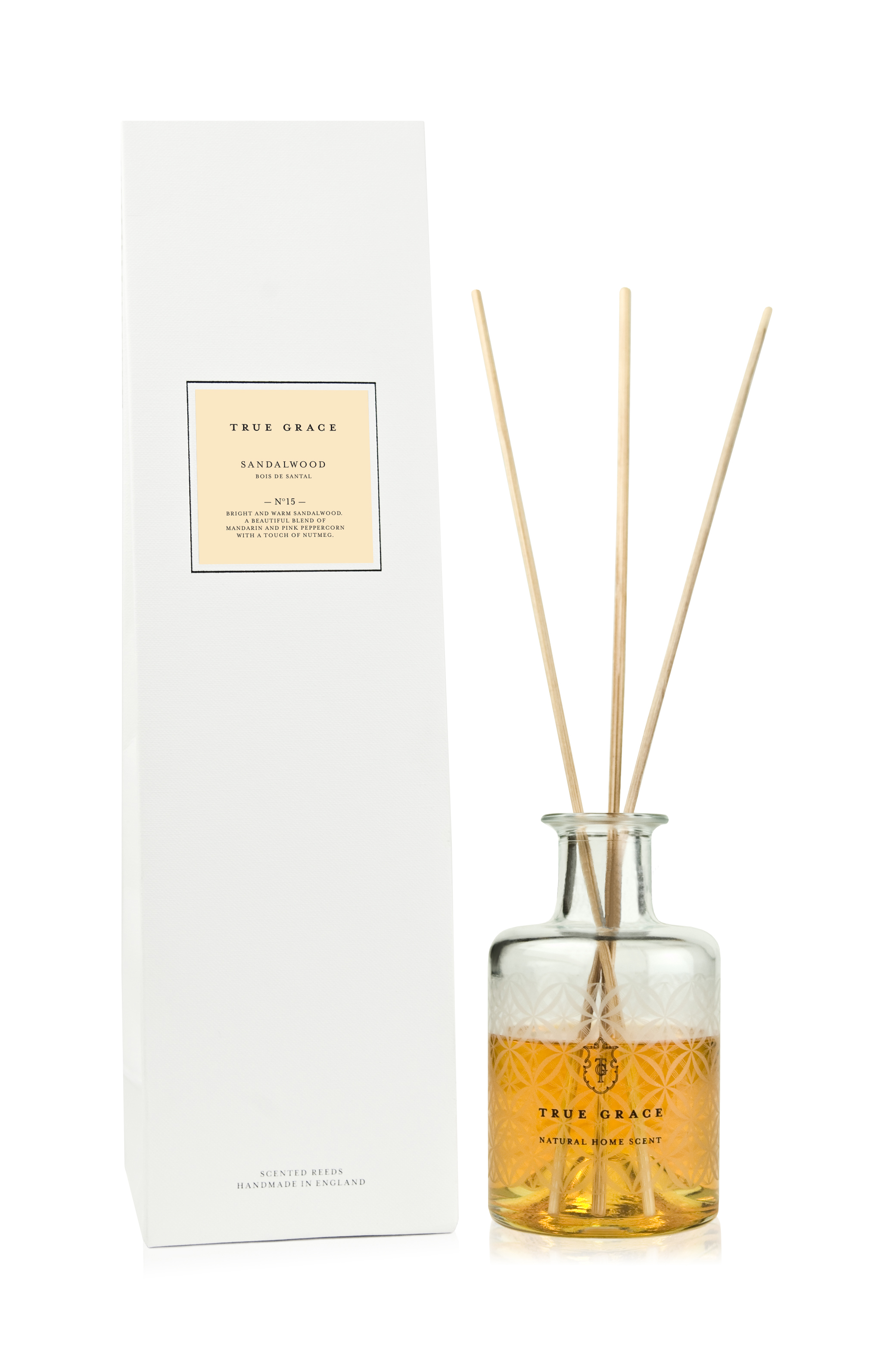 Bright, warm and rich sandalwood. A beautiful blend of mandarin and pink peppercorn with a touch of nutmeg, vetiver and patchouli.Top notes: Mandarin, pepper, cypress