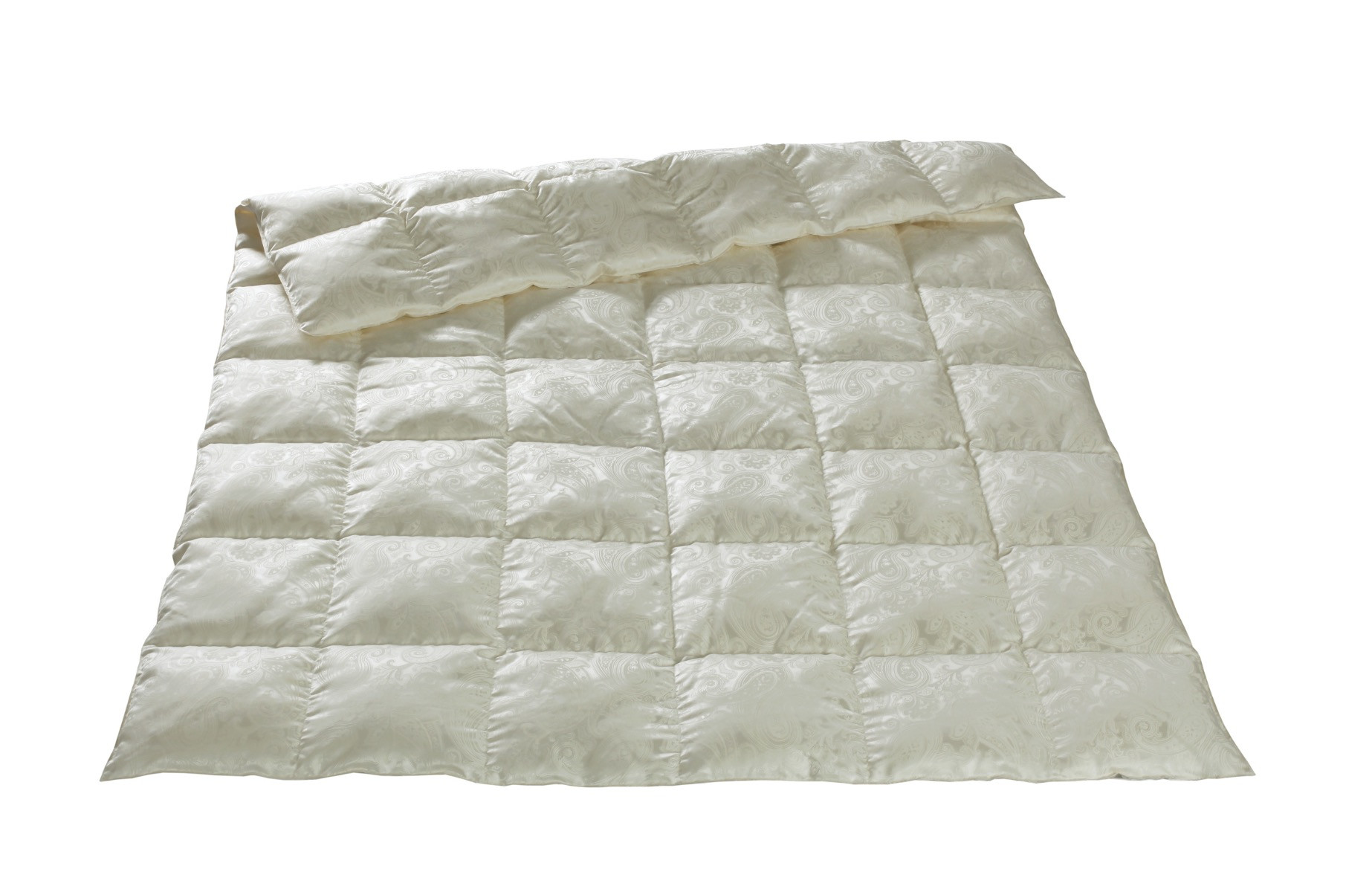 Всесезонна ковдра з наповнювачем зі 100% гусячого пуху вищого класу. Чохол ковдри виконаний з шовку. Ковдра простьобана прямокутниками.